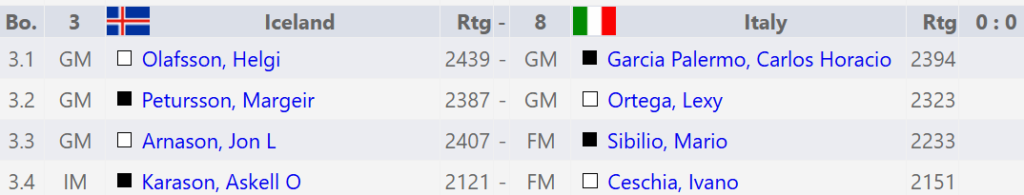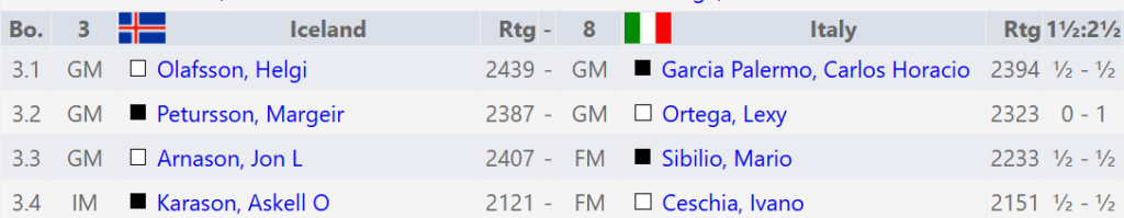 Margeir jafnaði taflið nokkuð þægilega og virtist hafa örlítið betra tafl og geta þæft stöðuna eitthvað áfram og séð hvernig aðstæður væru á öðrum borðum með þægilegan peðameirihluta á drottningarvæng. Því miður missti Margeir af leið Ortega til að koma drottningu sinni í spilið og á svipstundu hrundi svarta staðan og hvítur komin með mátsókn. Svekkjandi tap sem var ekki í samræmi við flæði skákarinnar.