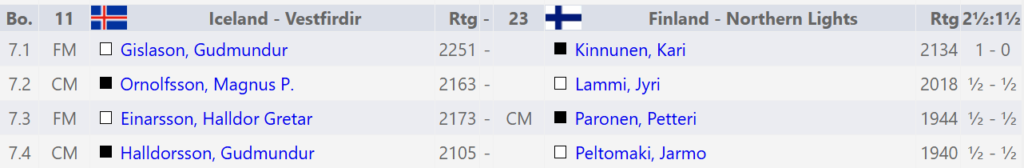 Vestfirðingarnir unnu með minnsta mun í sinni viðureign. Guðmundur Gíslason vann sína skák en aðrar enduðu með jafntefli, 7 af síðustu 8 skákum verið jafntefli hjá Vestfirðingunum sem komast nú vonandi í gang.