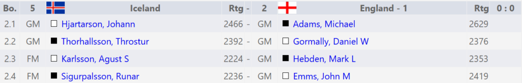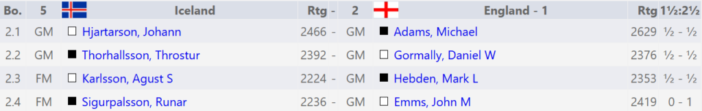 Jóhann fékk það verkefni að glíma við Adams á efsta borði. Skákin varð að maraþonskák, Adams reyndi í 127 leiki að finna leiðir í gegnum stöðu Jóhanns en varð ekki kápan úr klæðinu. Jóhann mun þó vafalítið þurfa hvíla á morgun eftir þessa skák!