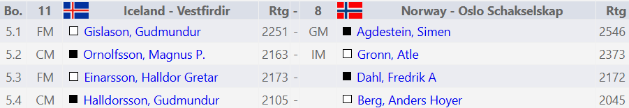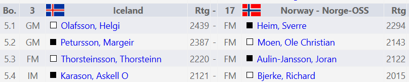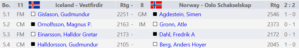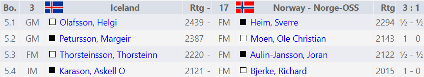 Vestfirðingarnir fengu norska sveit og alvöru verkefni hjá Guðmundi á efsta borði sem hann leysti með stakri prýði. Sá norski þandi sig á kóngsvæng en Guðmundur tók rými á miðborðinu. Læsing peðanna var hvítum í hag, ekki vottur af kóngssókn á h-línunni og þegar leið á taflið voru peð svarts á f5 og g4 orðin góð skotmörk. Satt best að segja sanngjarn sigur hjá Guðmundi og hann aldrei með verra tafl!