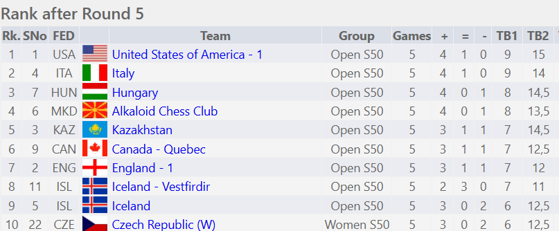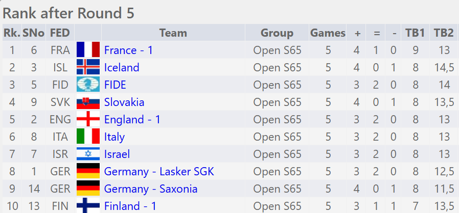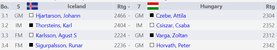 Íslenska liðið er í öðru sæti á eftir því franska sem er efst með 9. Ísland hefur fengið flesta vinninga það sem af er sem eru fyrstu oddastig á eftir viðureignarstigum. Næst á dagskrá er franska liðið sem er í efsta sæti og sigur þar myndi koma íslenska liðinu í toppsætið!