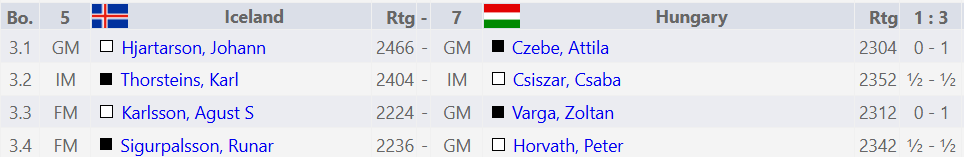 Á efsta borði tapaði Jóhann gegn stórmeistaranum Attila Czebe. Jóhann hafði fínt miðtafl og eftir smá flækjur virtist endataflið eiga að vera jafntefli. Hvíta kóngsstaðan var þó aðeins verri og svörtu peðin á e- og f- línunni urðu allt í einu stórhættuleg á meðan hvítur var styttra á veg kominn.