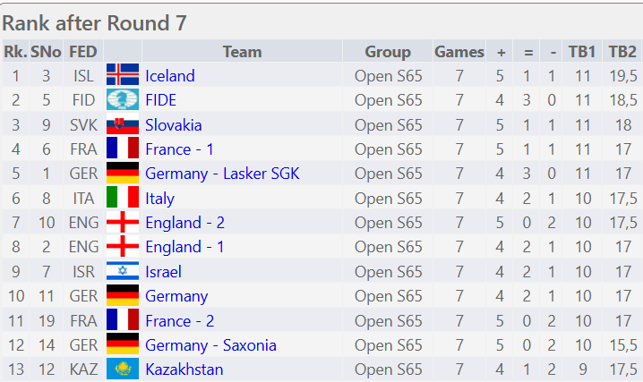 Íslenka liðið í 65+ flokkunum á Heimsmeistaramóti öldungasveita í Durres í Albaníu er ennþá í efsta sæti að lokinni sjöundu umferð sem fram fór í dag. Tvær umferðir eru eftir og lokaspretturinn æsispennandi. Íslenska liðið í 50+ flokknum vann sína viðureign og á einhverja möguleika á því að komast á verðlaunapall með góðum endaspretti. Vestfirska liðið gerði jafntefli í sinni viðureign.