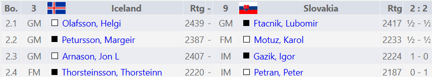 Helgi hafði hvítt á fyrsta borði gegn hinum margreynda teóríuhesti Lubomir Ftacnik. Upp kom broddgöltur og Helgi bauð jafntefli í hnífjöfnu miðtafli, líklegast skynsamleg ákvörðun.