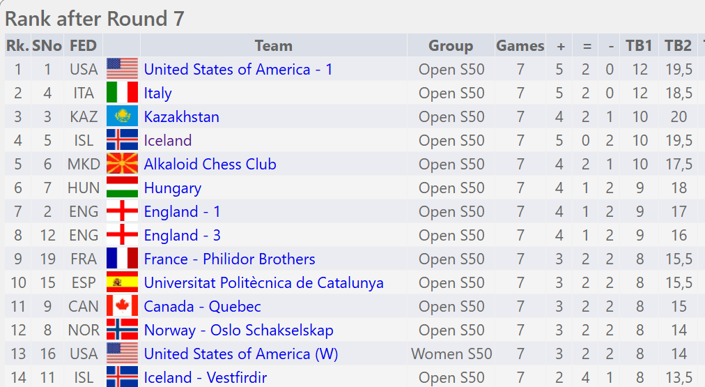 Bandaríkjamenn enn efstir en Ítalía búnir að ná þeim að vinningum. Ísland hoppar upp í 4. sætið úr því 7. en Vestfirðir detta niður í 14. sætið.