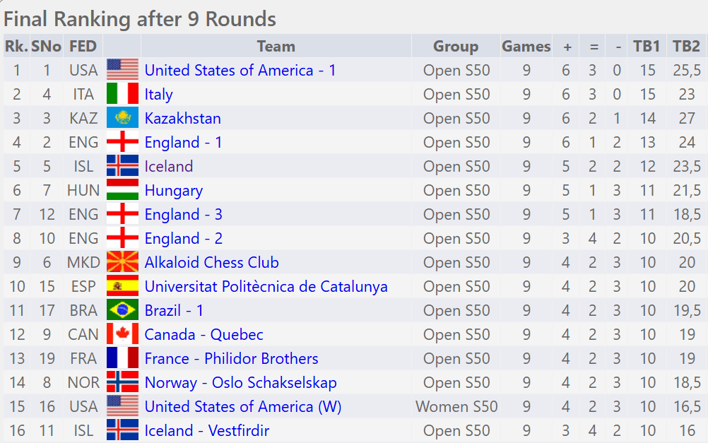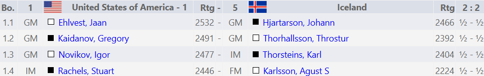 Bandaríkjamenn tryggðu sigurinn með jafnteflinu við Ísland. Ísland endar í 5. sæti, sama og styrkleikaröðunin og Vestfirðir enduðu í 16. sæti.