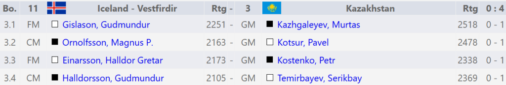 Þegar hér er komið við sögu er staðan 1-1 og vinningar ólíklegir á 2. og 4. borði hjá okkar mönnum sem sátu eftir með svörtu mennina. Kosten gegn Margeiri hefði þó þurft að taka sénsa og menn inni á borðinu, við hefðum þurft smá heppni þar til að eiga séns. Slóvakarnir virtust á sama tíma mögulega ætla að rétta hjálparhönd. Igor Gazik átti nánast vinning „on the spot“ og aðrar stöður þannig að Slóvakar voru þá ekki að tapa.