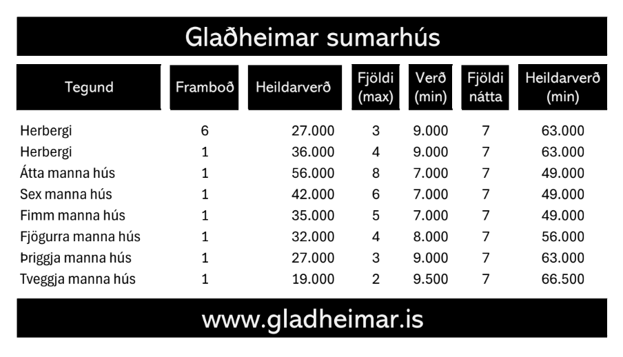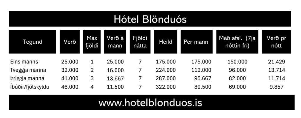 Hér að neðan má sjá sundurliðun á verðum hjá Hótel Blönduósi og Glaðheimum.