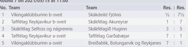 Víkingaklúbburinn endurheimti efsta sætið með 7-1 stórsigri á Breiðabliki í sjöundu umferð. SSON sem var efst fyrir umferðina tapaði hins vegar 3-5 fyrir Hugin þar sem það það vakti athygli að Huginsmenn töpuðu einni skák í ótefldri skák. Eitthvað sem gæti reynst dýrt í mótslok.