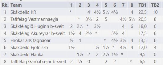Öðrum viðureignum lauk öllum með stórsigrum sem fóru ýmist 7-1 eða 7½-½. Fjölnir, SA og TR unnu þær viðureignir. Með þeim sigrum hafa þau nánast gulltryggt sig inn í nýja úrvalsdeild sem hefst í haust.