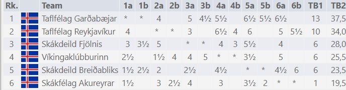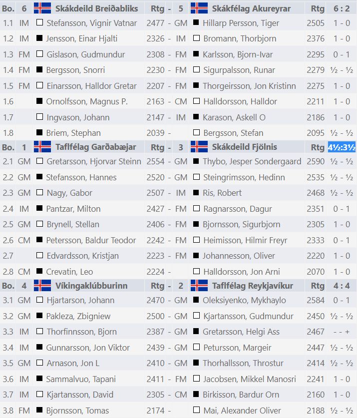 TG hefur 13 stig. TR hefur 10 stig. Skákdeild Breiðabliks vann öruggan, 6-2, sigur á Skakfélagi Akureyrar í gær. Þar með er ljóst að Akureyringar falla úr úrveilsdeildinni. Mikil barátta er um bronsið en um það berjast Fjölnir, Víkingaklúbburinn og Breiðablik. Öll liðin hafa 6 stig. Þrjú efstu sætin gefa keppnisrétt á EM taflfélaga sem fram fer í Austurríki í október.
