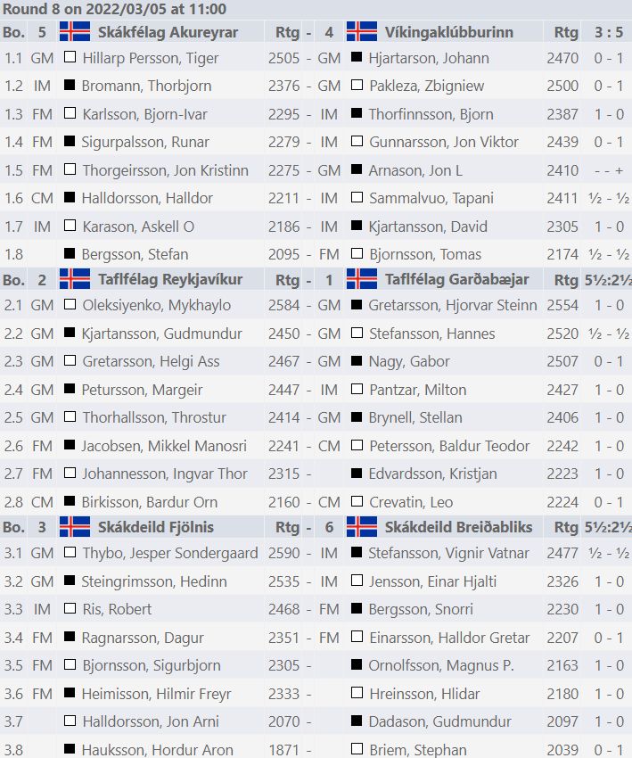 Þess má geta geta að Vignir Vatnar Stefánsson rauf 2500 stigamúrinn með jafnteflinu í dag og vantar því aðeins einn áfanga til að klára stórmeistaratitilinn. Skákfélag Akureyrar er nú formlega fallið í 1. deild.