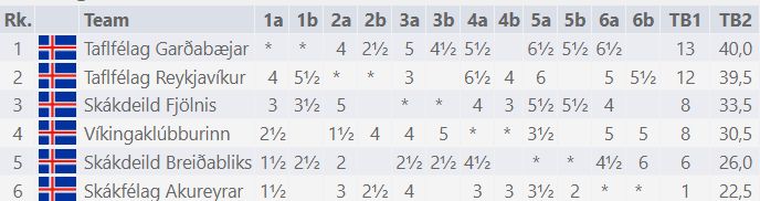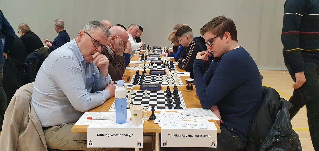 Taflfélag Vestmannnaeyja er í forystu í með 9 stig, b-sveit Skákfélags Akureyrar er í öðru sæti með 8 stig og Skákdeild KR í þriðji sæti með 7 stig.