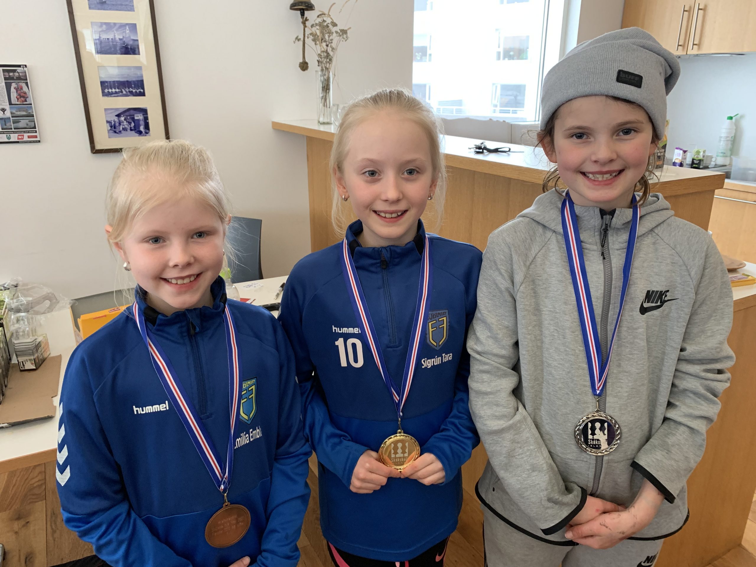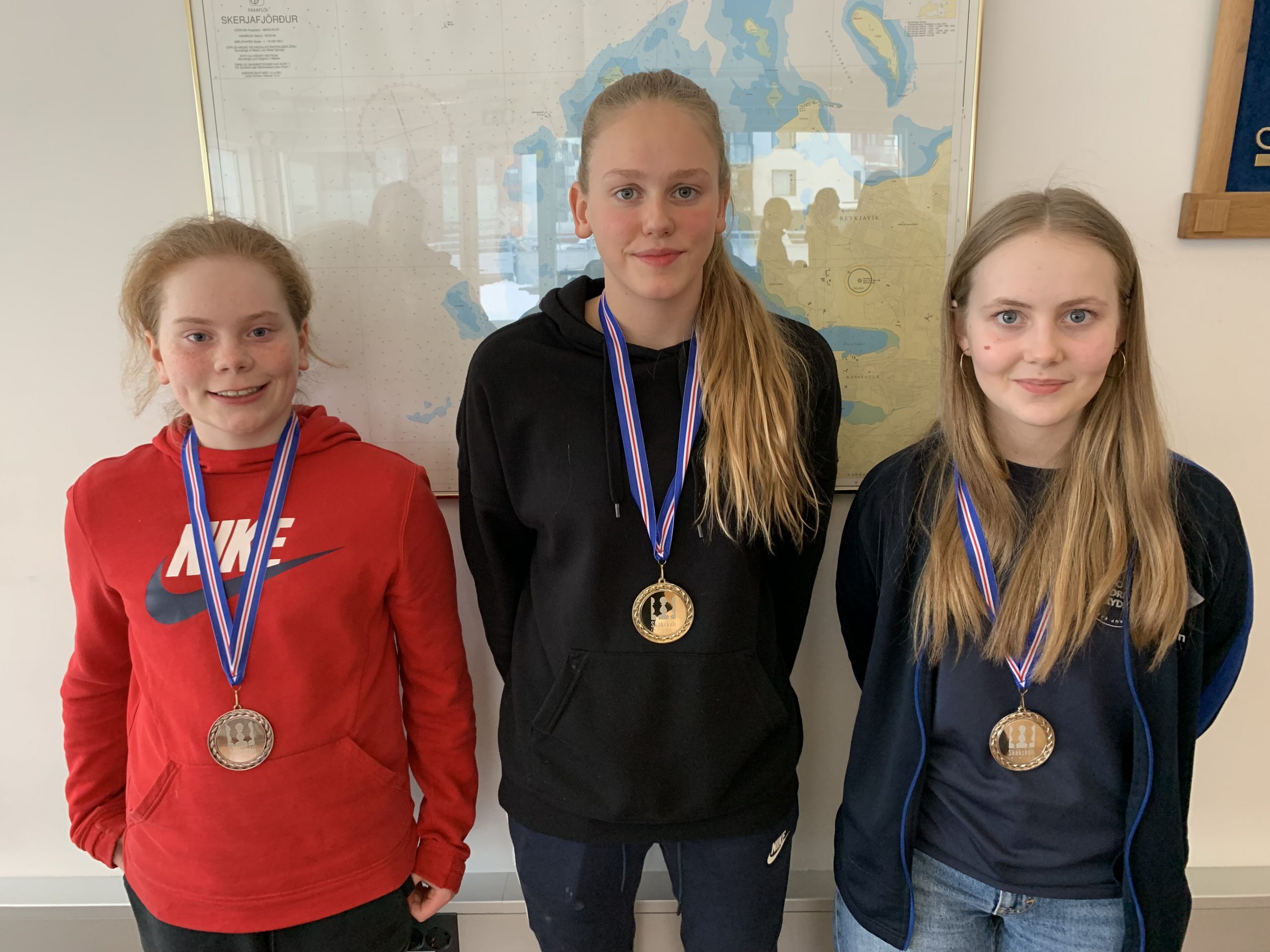 Þrjár efstu á hraðskákmóti stúlkna: Guðrún Fanney Briem, Freyja Birkisdóttir og Iðunn Helgadóttir- verðlaun: Freyja Birkisdóttir